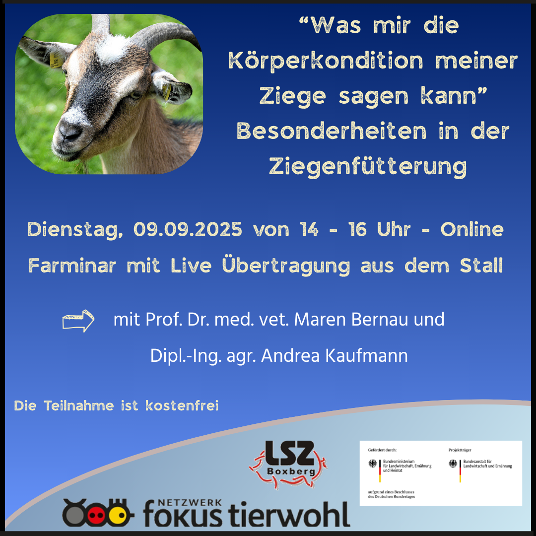 Am Dienstag den 09.09.2025 findet eine Online-Veranstaltung zum Thema artgerechte Fütterung und Körperkonditionsbeurteilung von Ziegen statt. Das Farminar wird organisiert in Zusammenarbeit der Ziegenzuchtverbände Baden-Württemberg und Bayern, dem Projekt „GesundeZiegen“ und dem Verbundprojekt Netzwerk Fokus Tierwohl. Aufgrund der Förderung durch das BMLEH ist die Teilnahme für Sie kostenfrei. Weitere Informationen finden Sie in der Einladung und im Flyer.