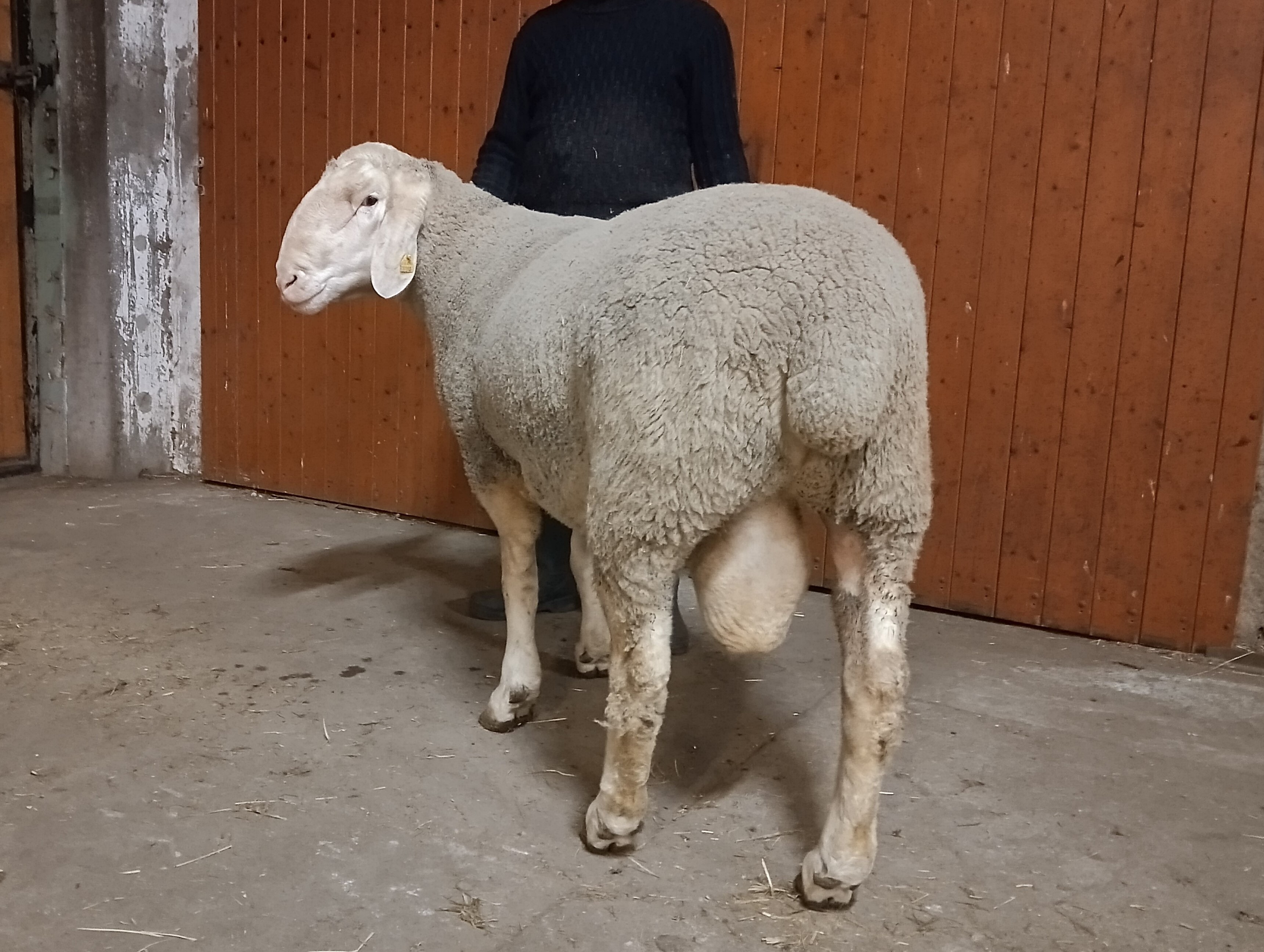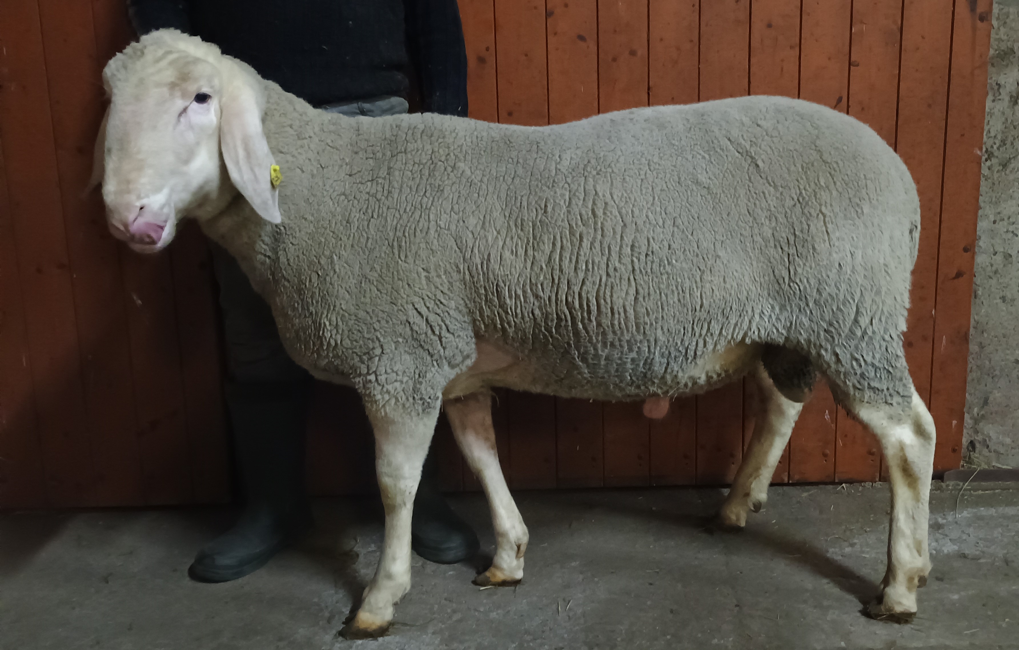 geboren: 14.10.2024, Zwilling, Rasse MLS, M-Linie, Vater: DE 01 15 005 52216 SA-RF, mit 97 Tagen 54,0 kg gewogen, tgl. Zunahme 515 g, Körung mit 133,0 kg, WBE 8/8/8, ARR/ARQ