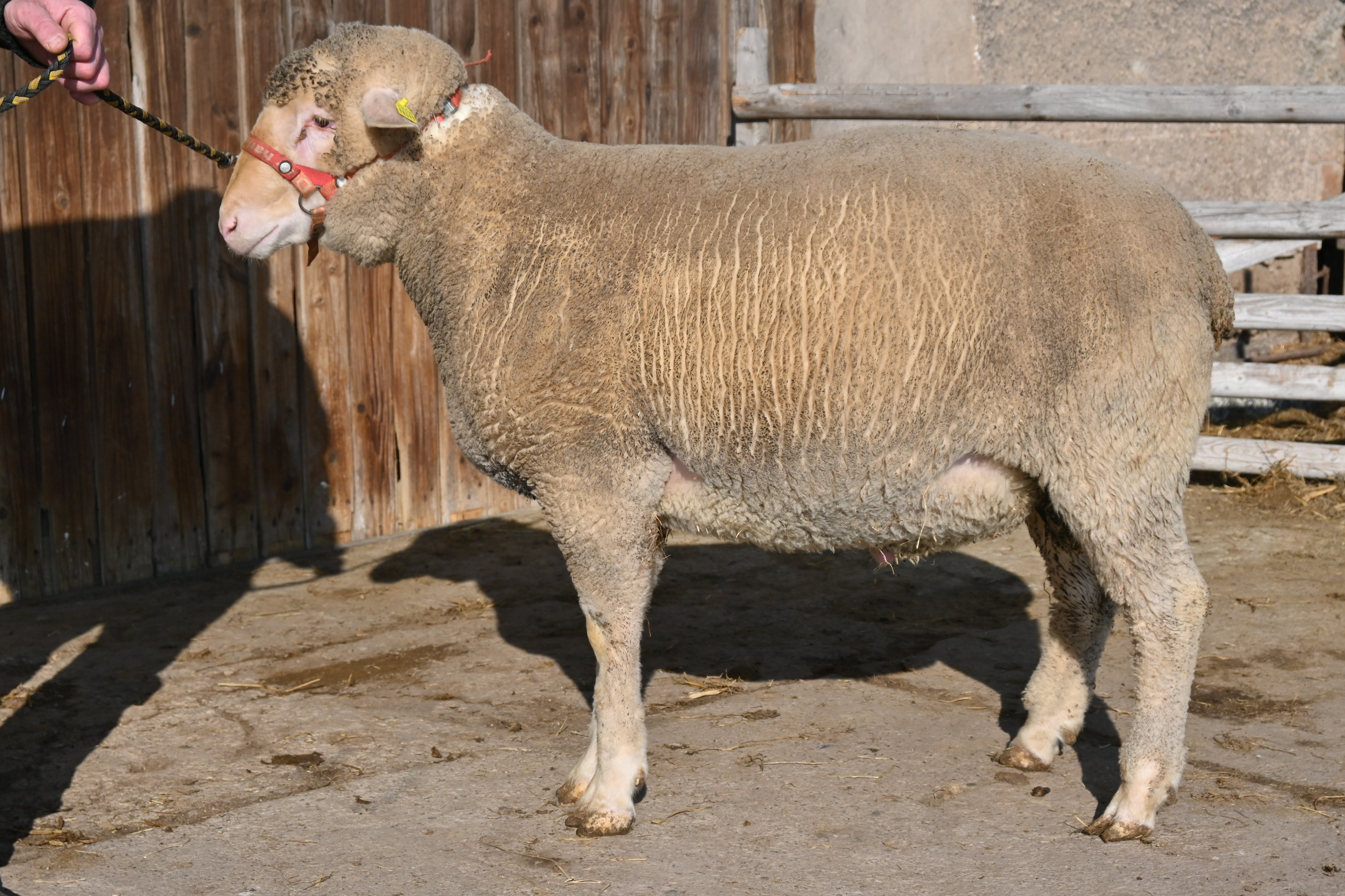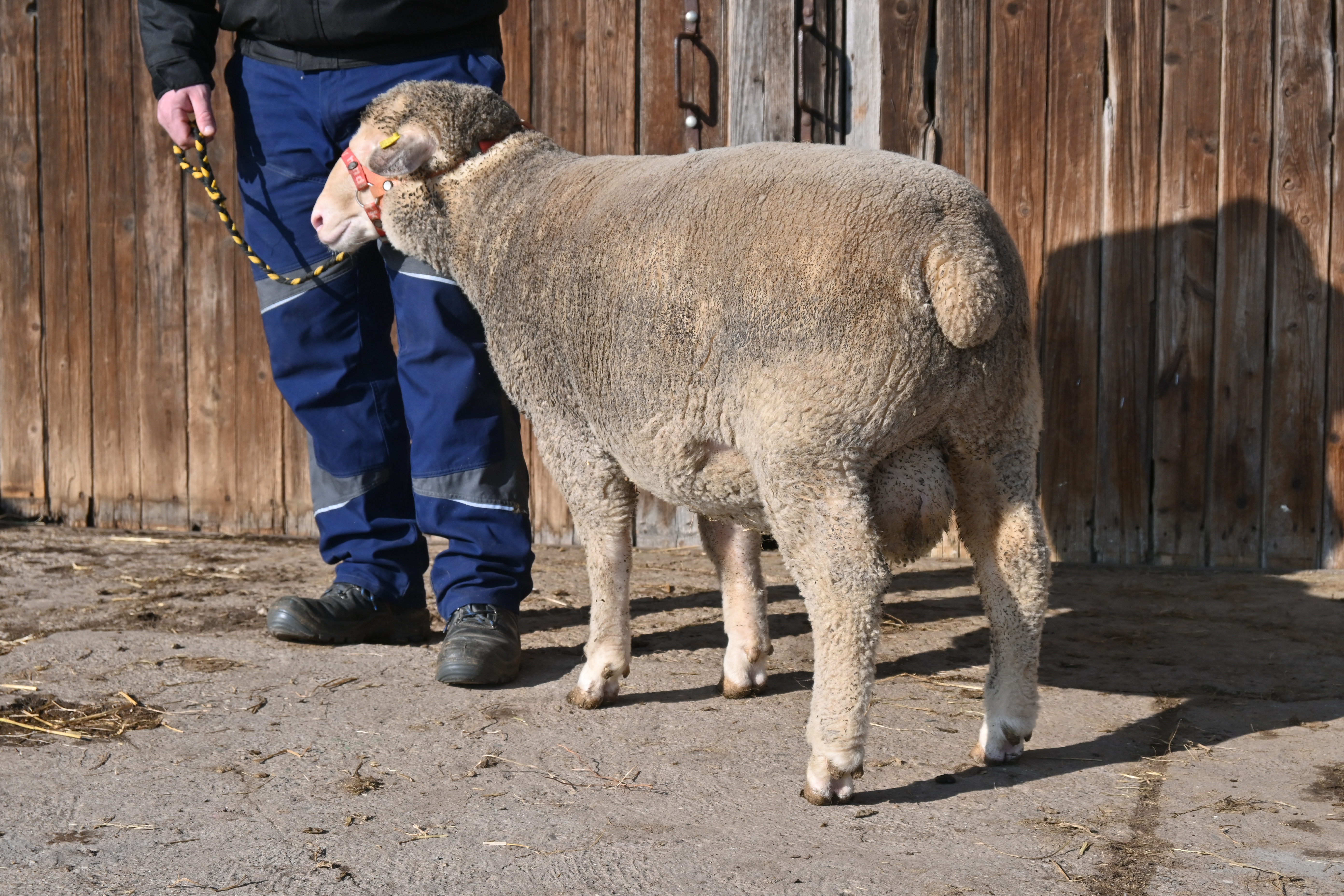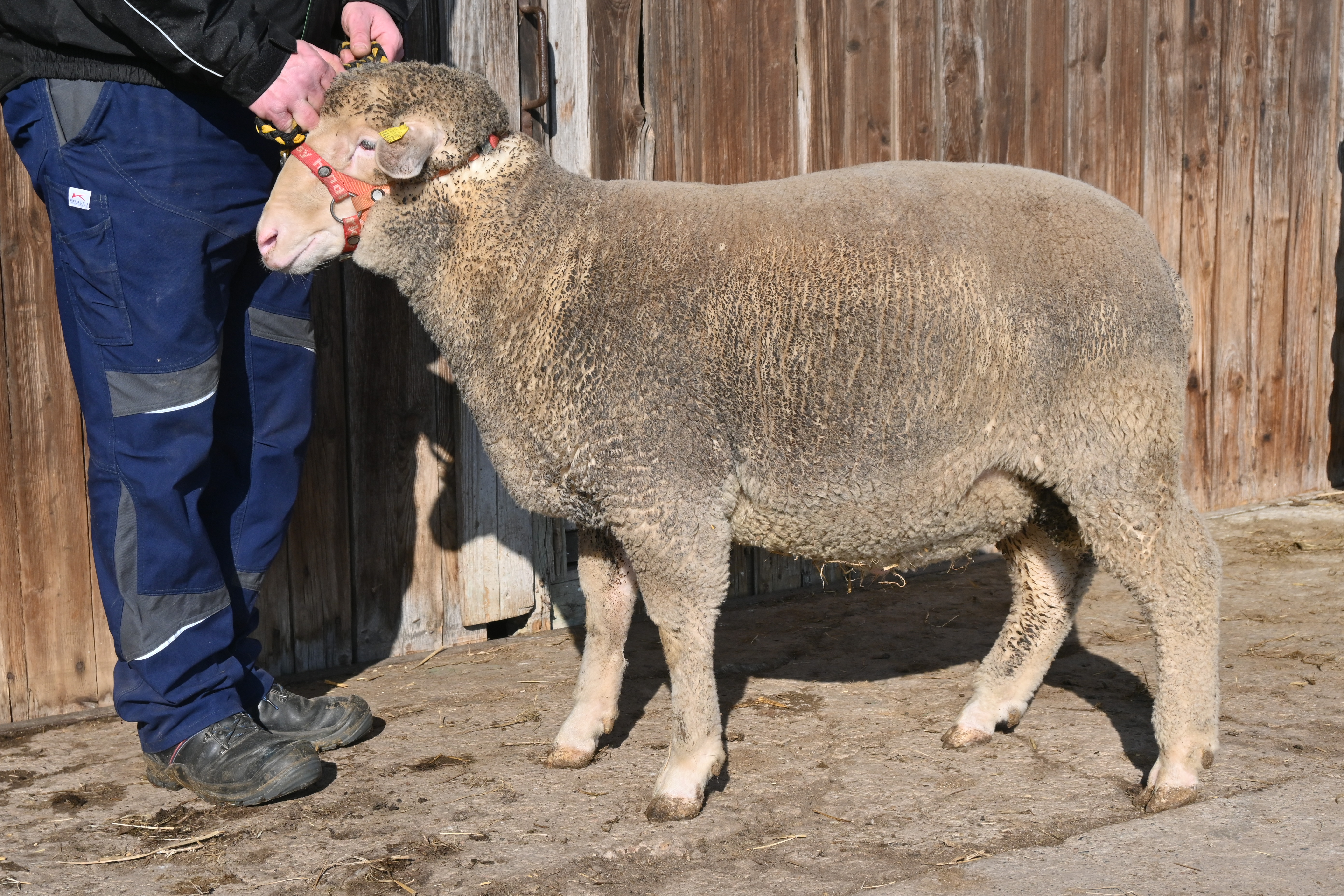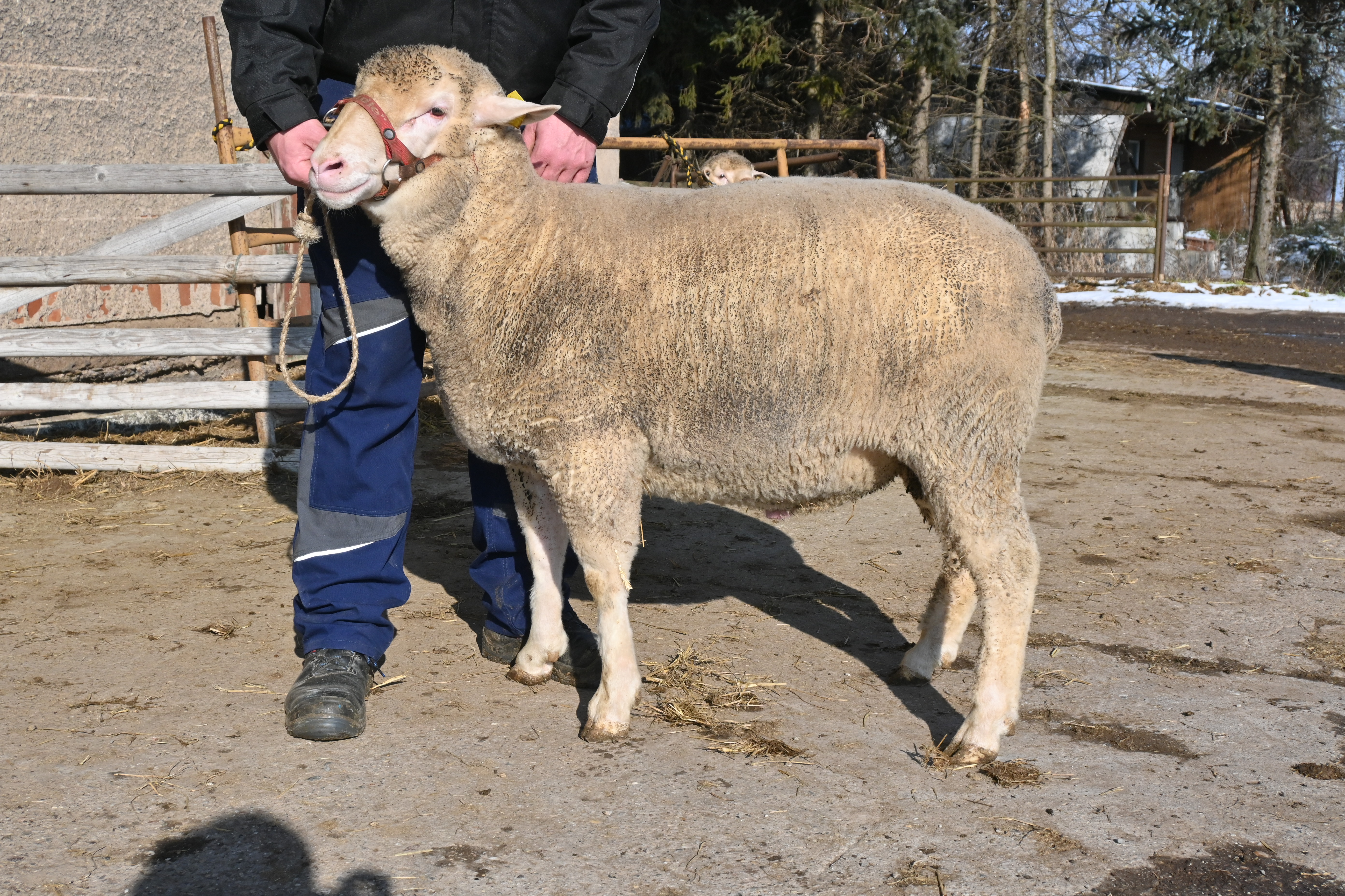 geboren: 11.11.2023, Zwilling, Vater: DE 01 03 115 95474 NDS-R, Linie BME, mit 107 Tagen 48,8 kg gewogen, tgl. Zunahme 409 g, Muskeldicke und Fettauflage bei Ultraschallmessung 31,8 mm und 8,3 mm, Körung mit 97,0 kg, WBE 8/7/7, ARR/ARR, Wollfeinheit 27,27 µm, Streuung 15,82 %