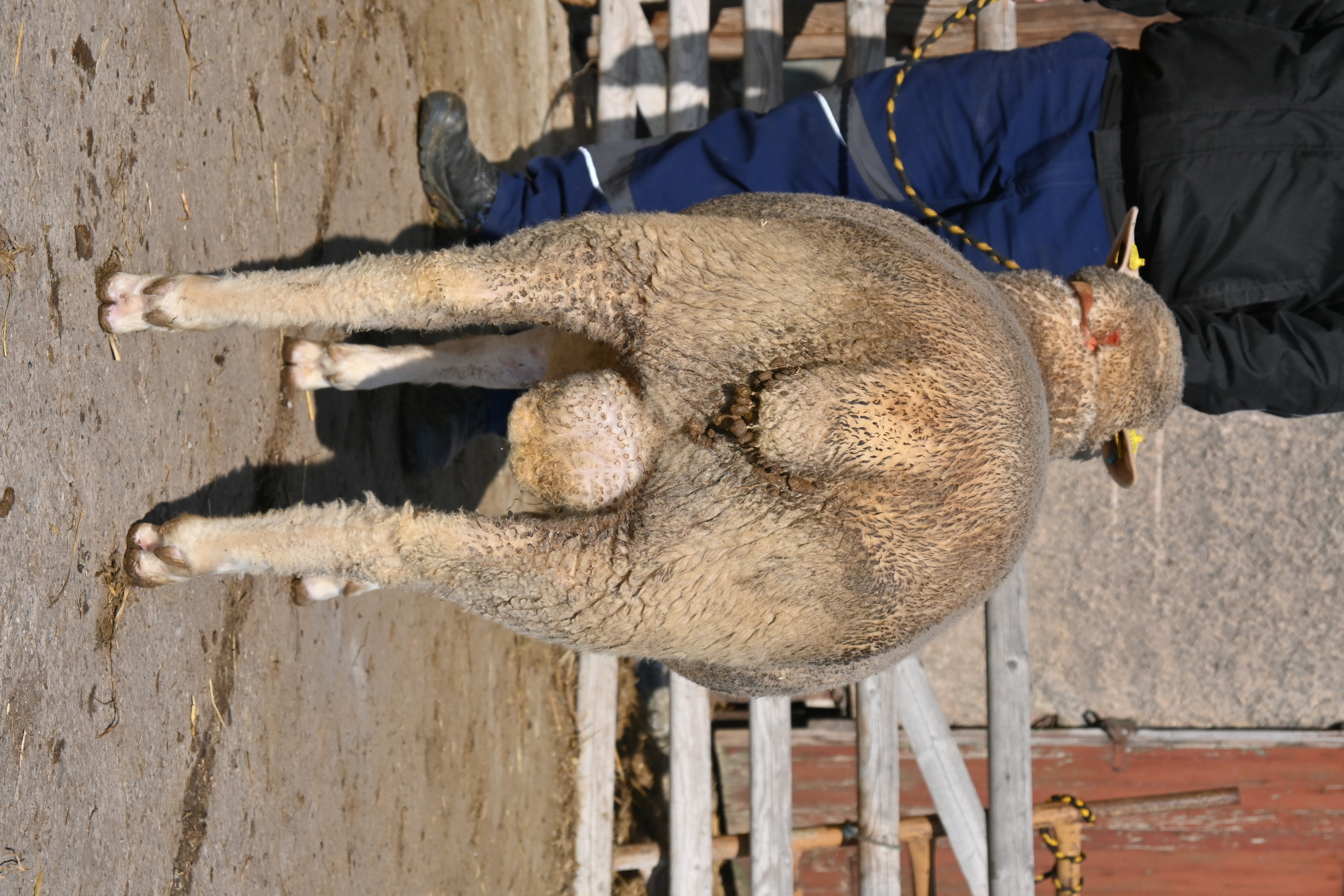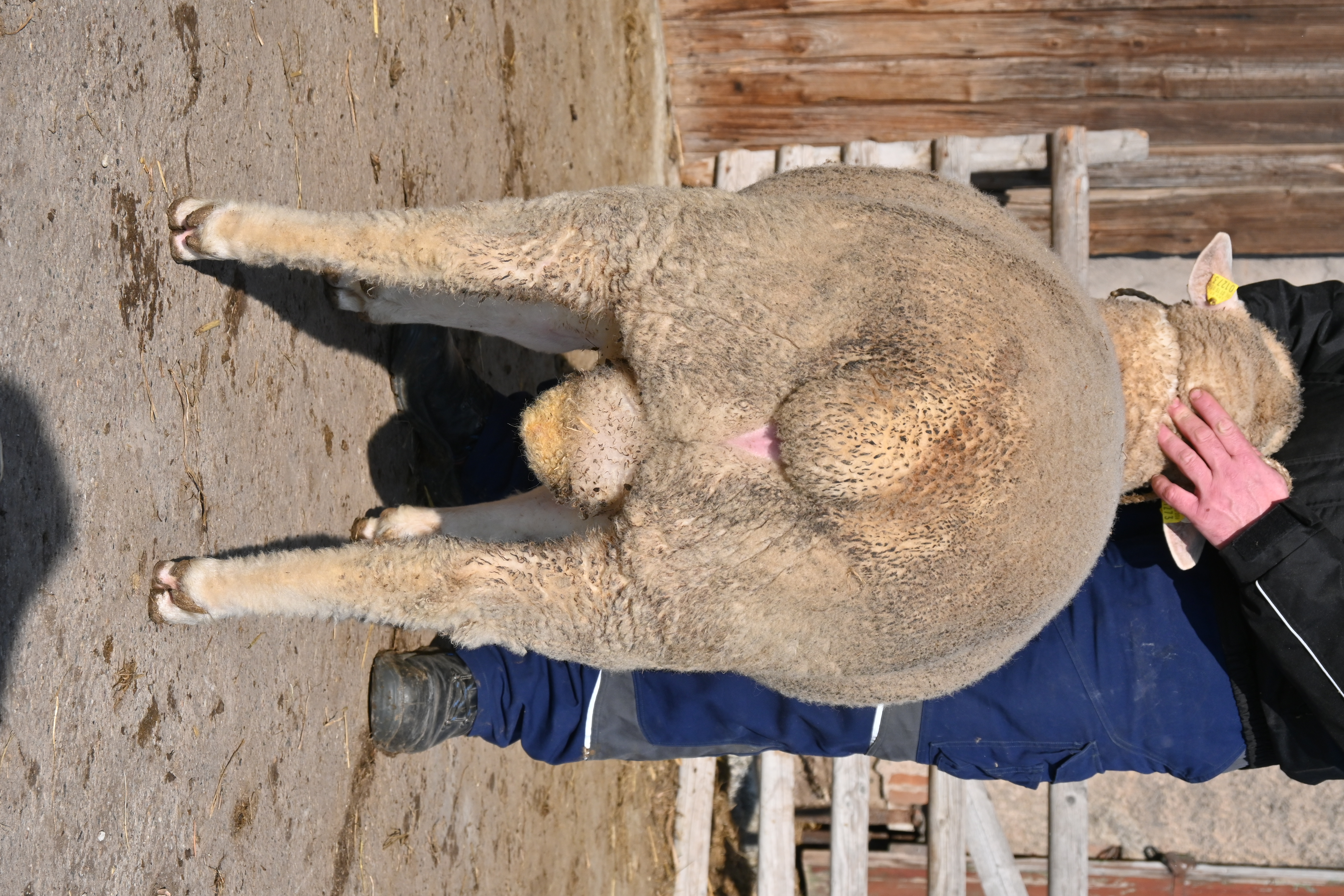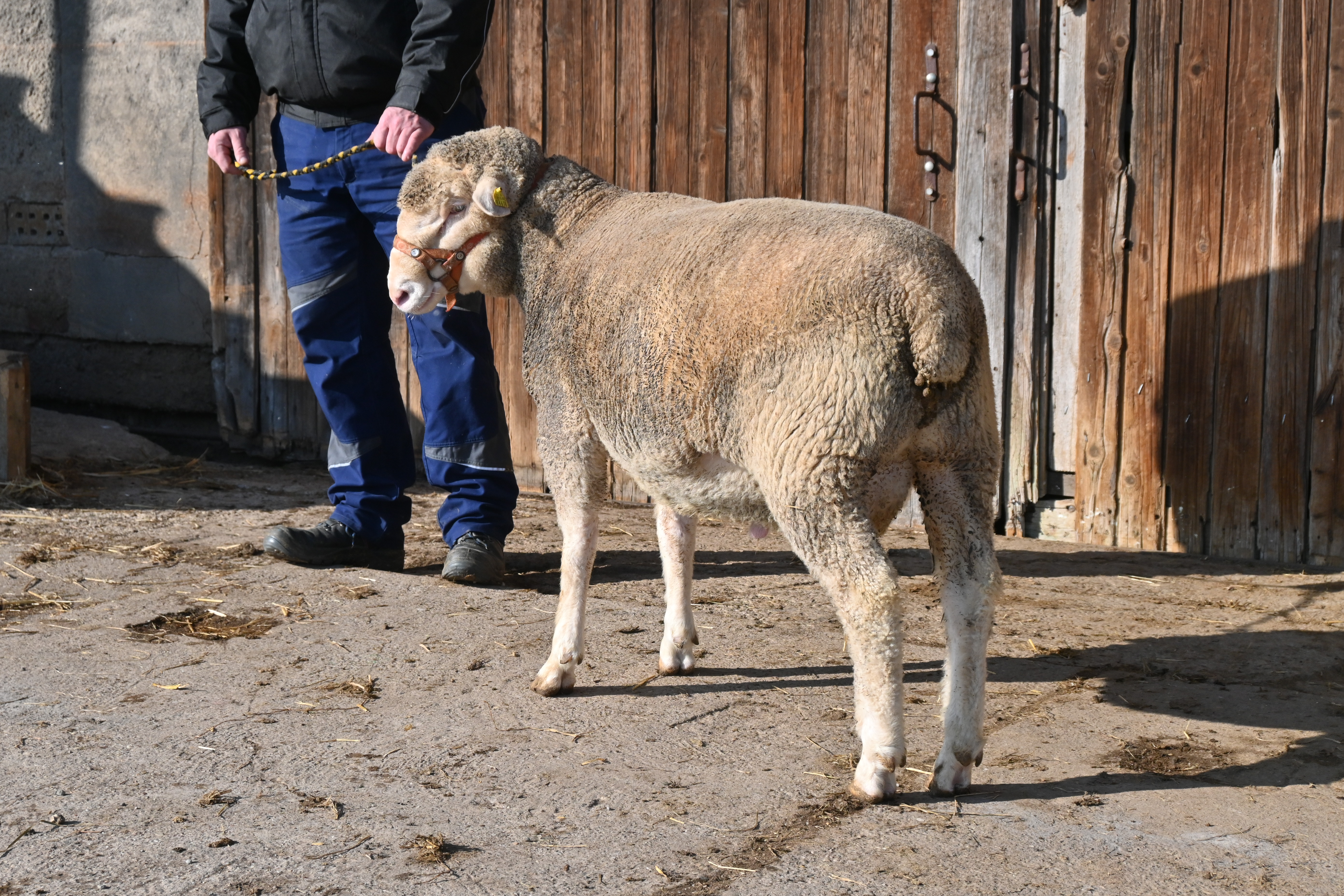 geboren: 11.11.2023, Zwilling, Vater: DE 01 03 115 95474 NDS-R, Linie BME, mit 107 Tagen 48,8 kg gewogen, tgl. Zunahme 409 g, Muskeldicke und Fettauflage bei Ultraschallmessung 31,8 mm und 8,3 mm, Körung mit 97,0 kg, WBE 8/7/7, ARR/ARR, Wollfeinheit 27,27 µm, Streuung 15,82 %