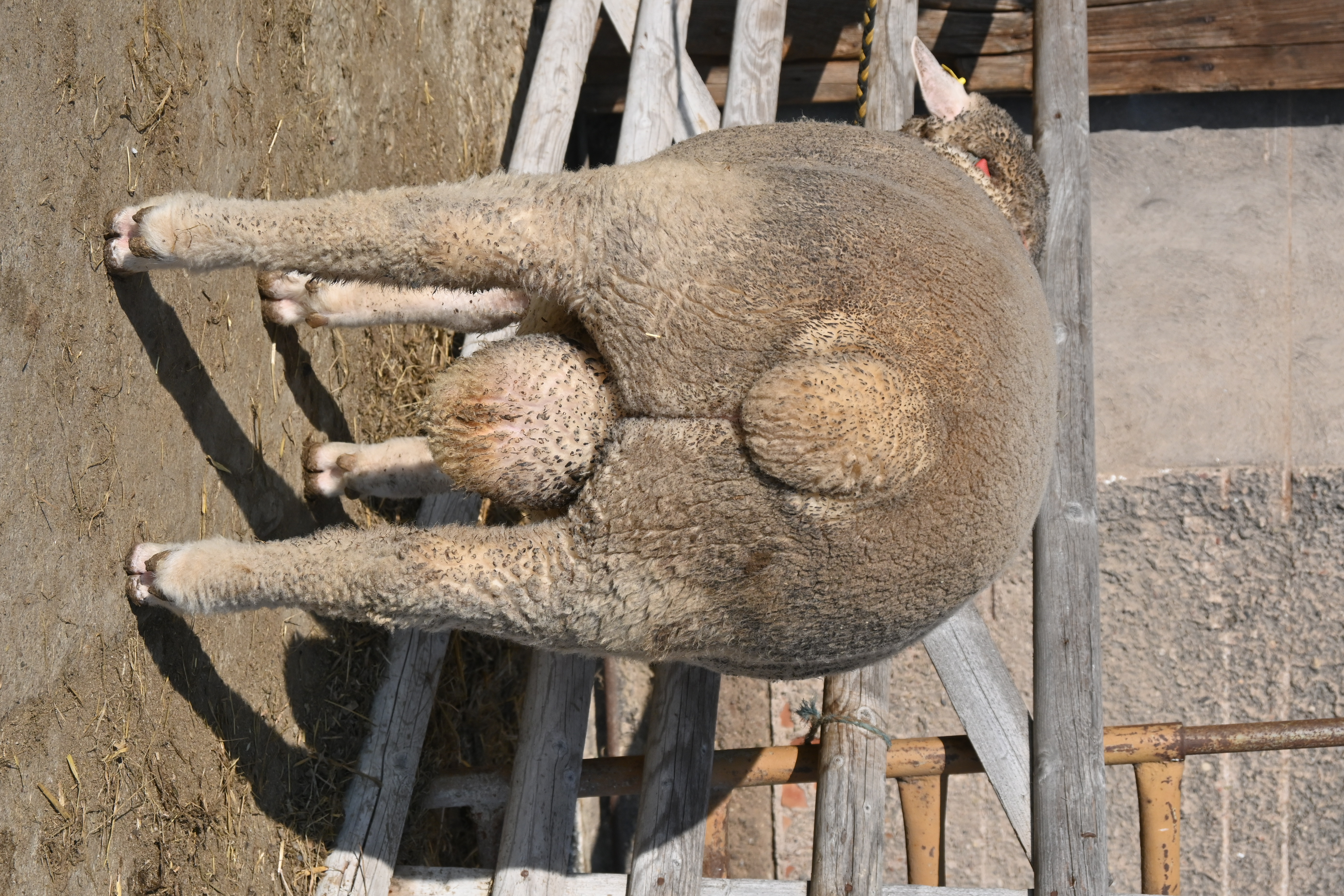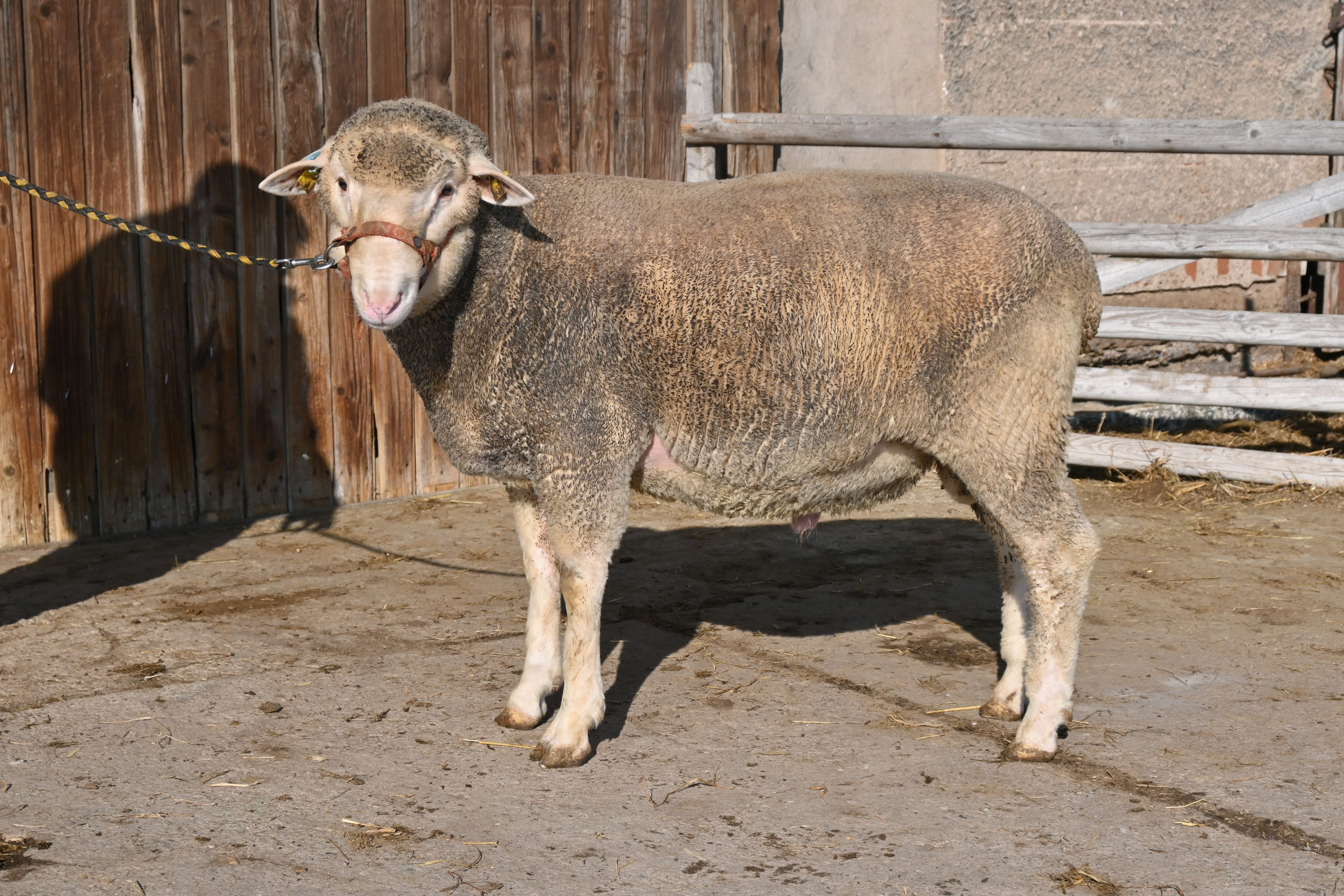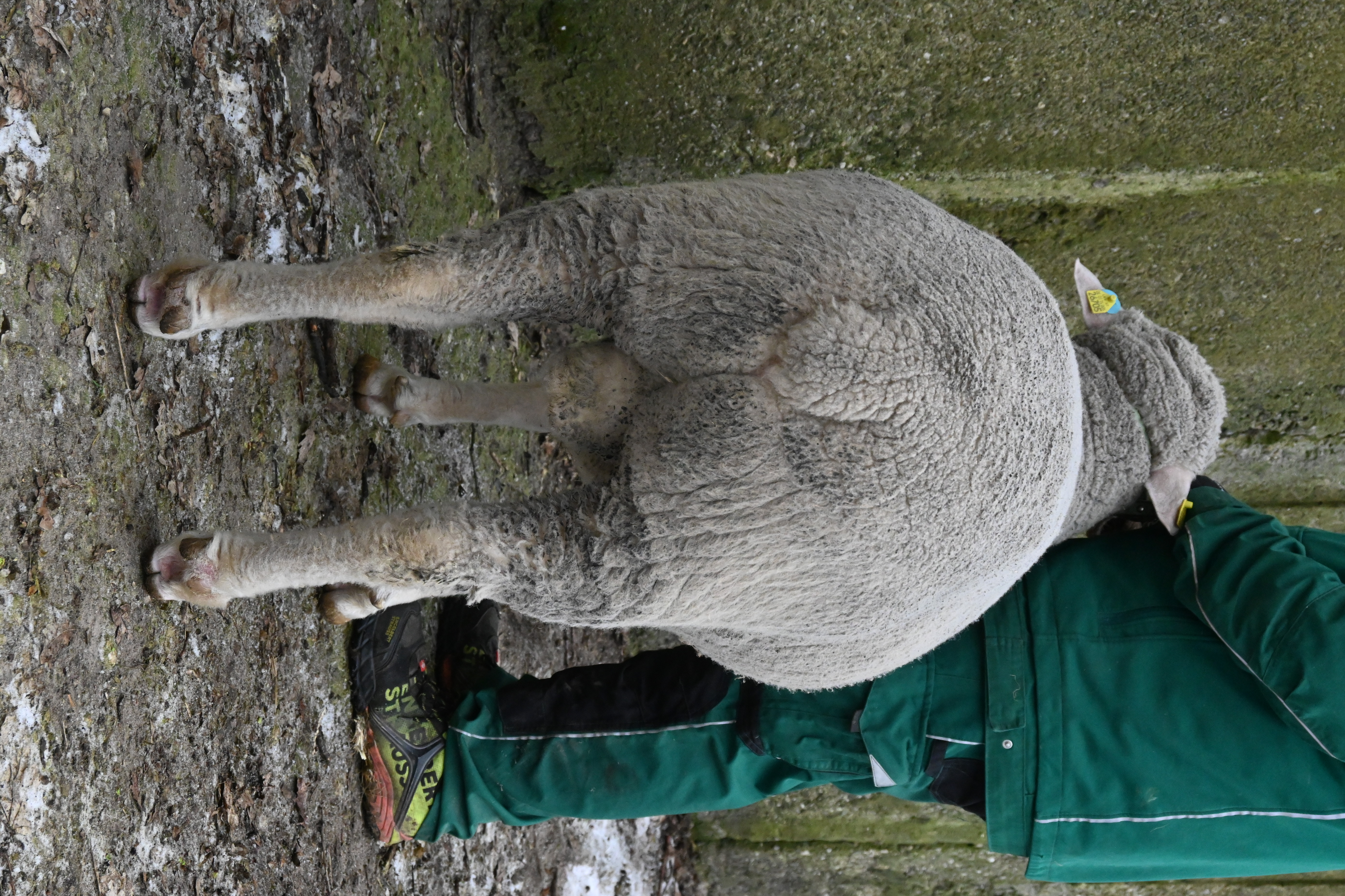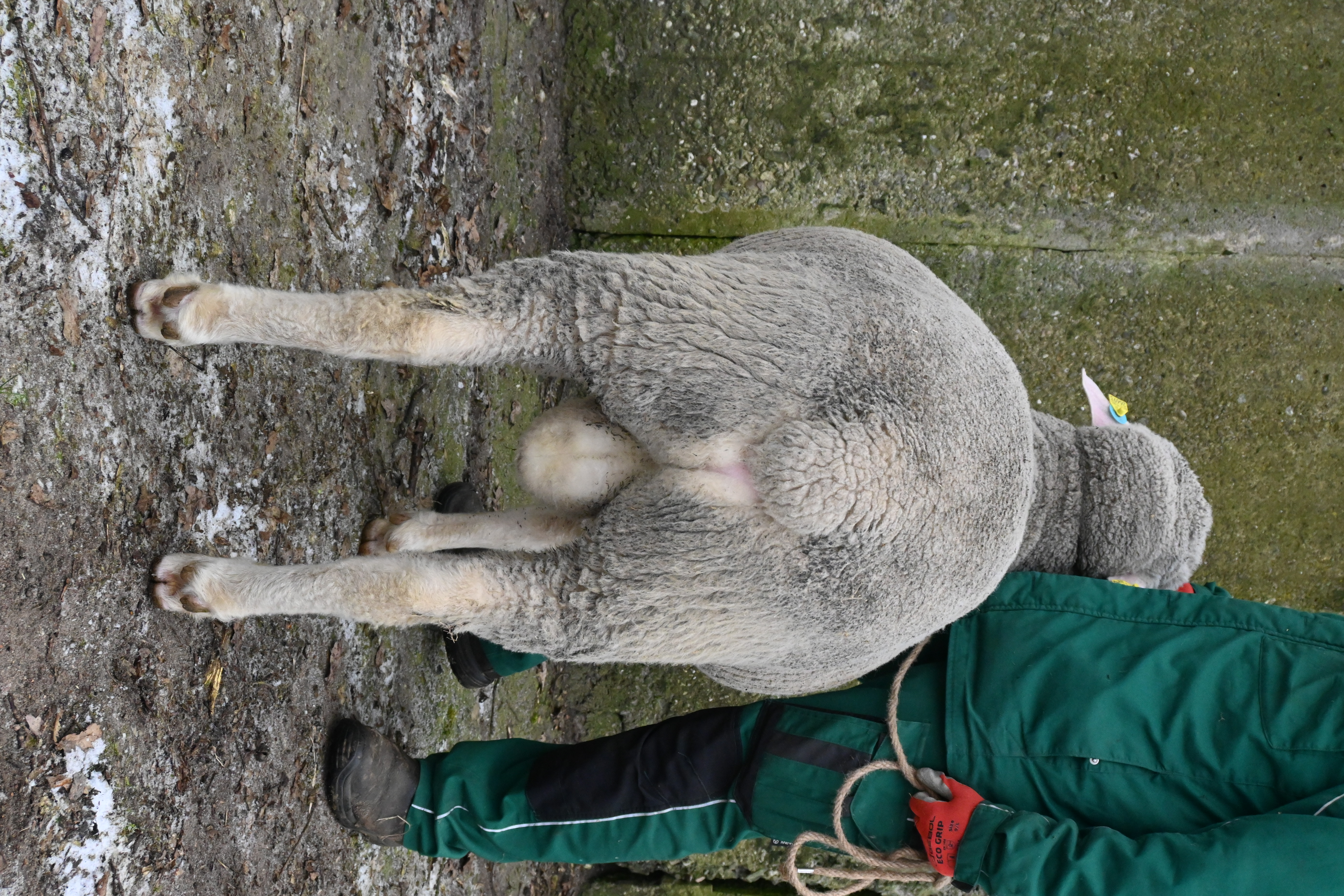 geboren: 11.11.2023, Zwilling, Vater: DE 01 03 115 95474 NDS-R, Linie BME, mit 107 Tagen 48,8 kg gewogen, tgl. Zunahme 409 g, Muskeldicke und Fettauflage bei Ultraschallmessung 31,8 mm und 8,3 mm, Körung mit 97,0 kg, WBE 8/7/7, ARR/ARR, Wollfeinheit 27,27 µm, Streuung 15,82 %