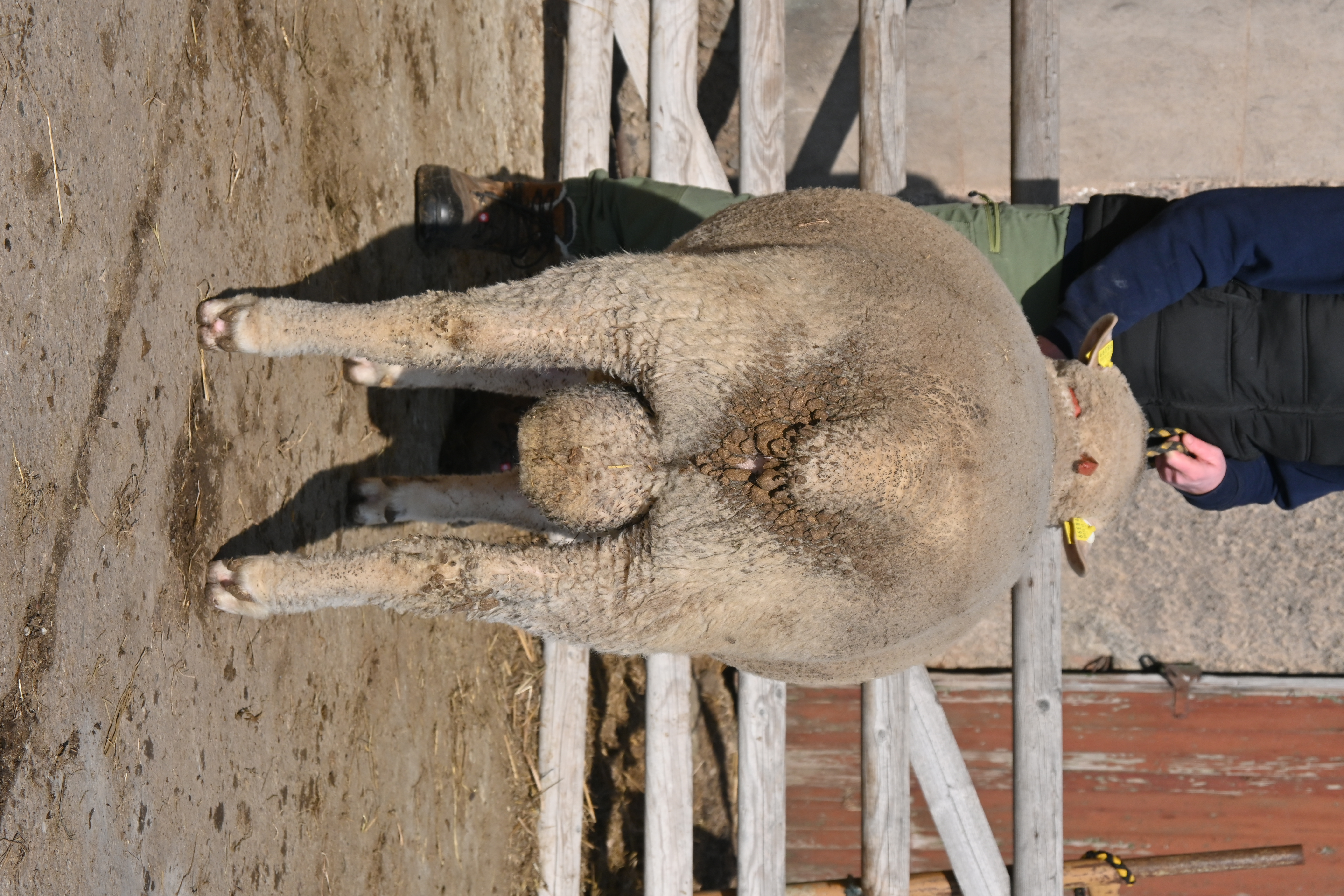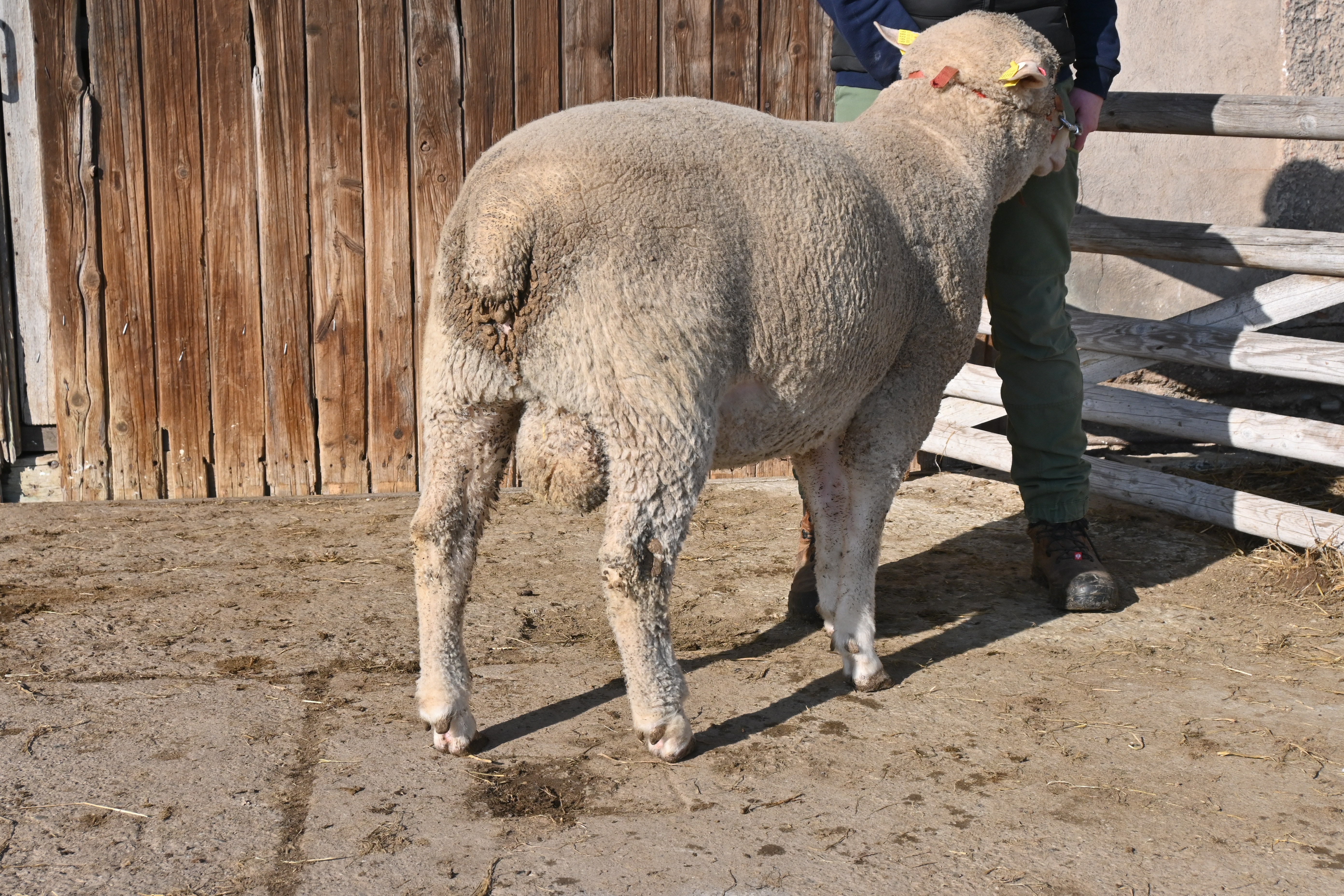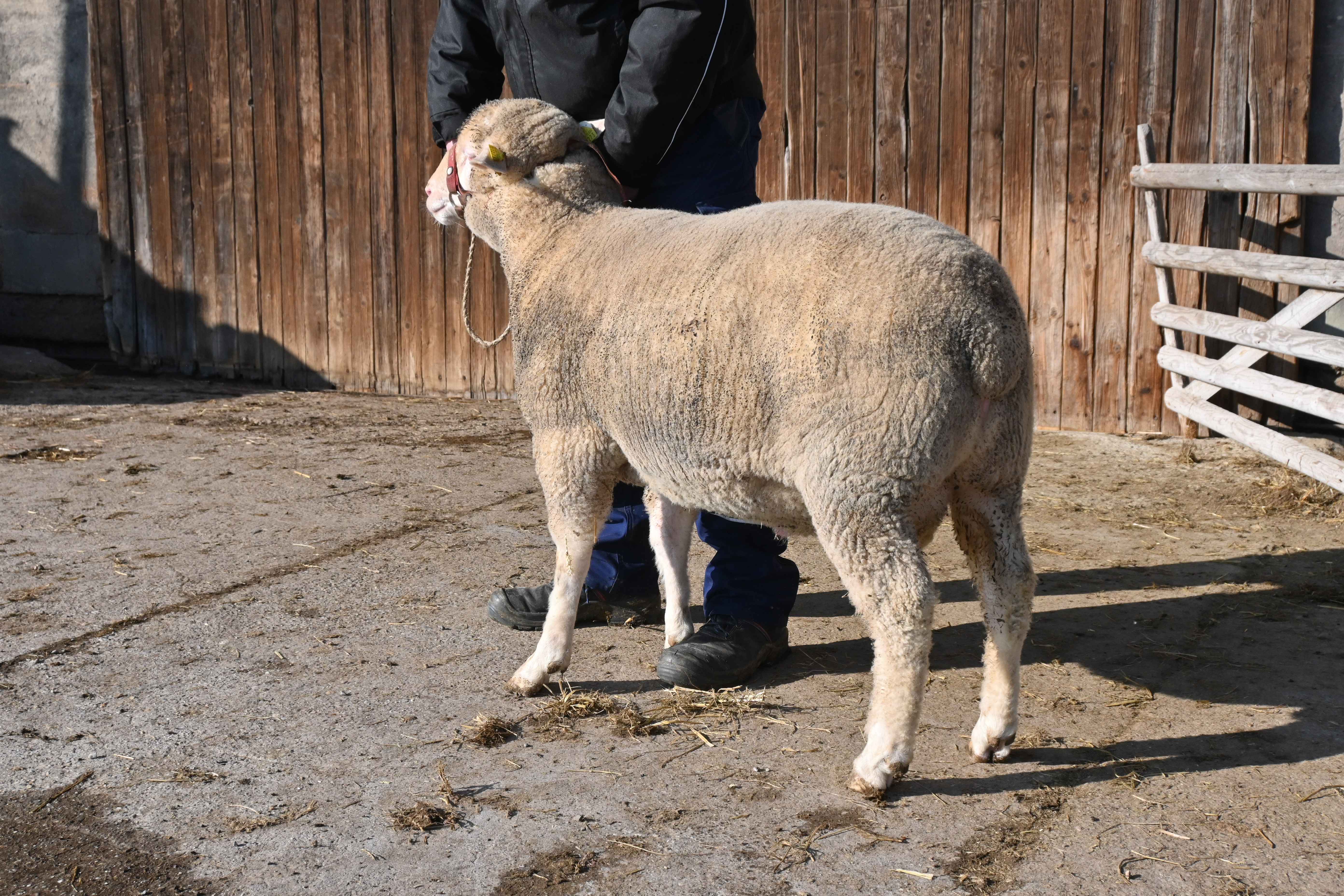 geboren: 12.11.2023, Einling, Vater: DE 01 14 006 12049 SN-KÖ, Linie BMB, mit 106 Tagen 44,0 kg gewogen, tgl. Zunahme 368 g, Muskeldicke und Fettauflage bei Ultraschallmessung 27,8 mm und 8,1 mm, Körung mit 89,0 kg, WBE 7/7/7, ARR/ARR, Wollfeinheit 25,63 µm, Streuung 16,98 %