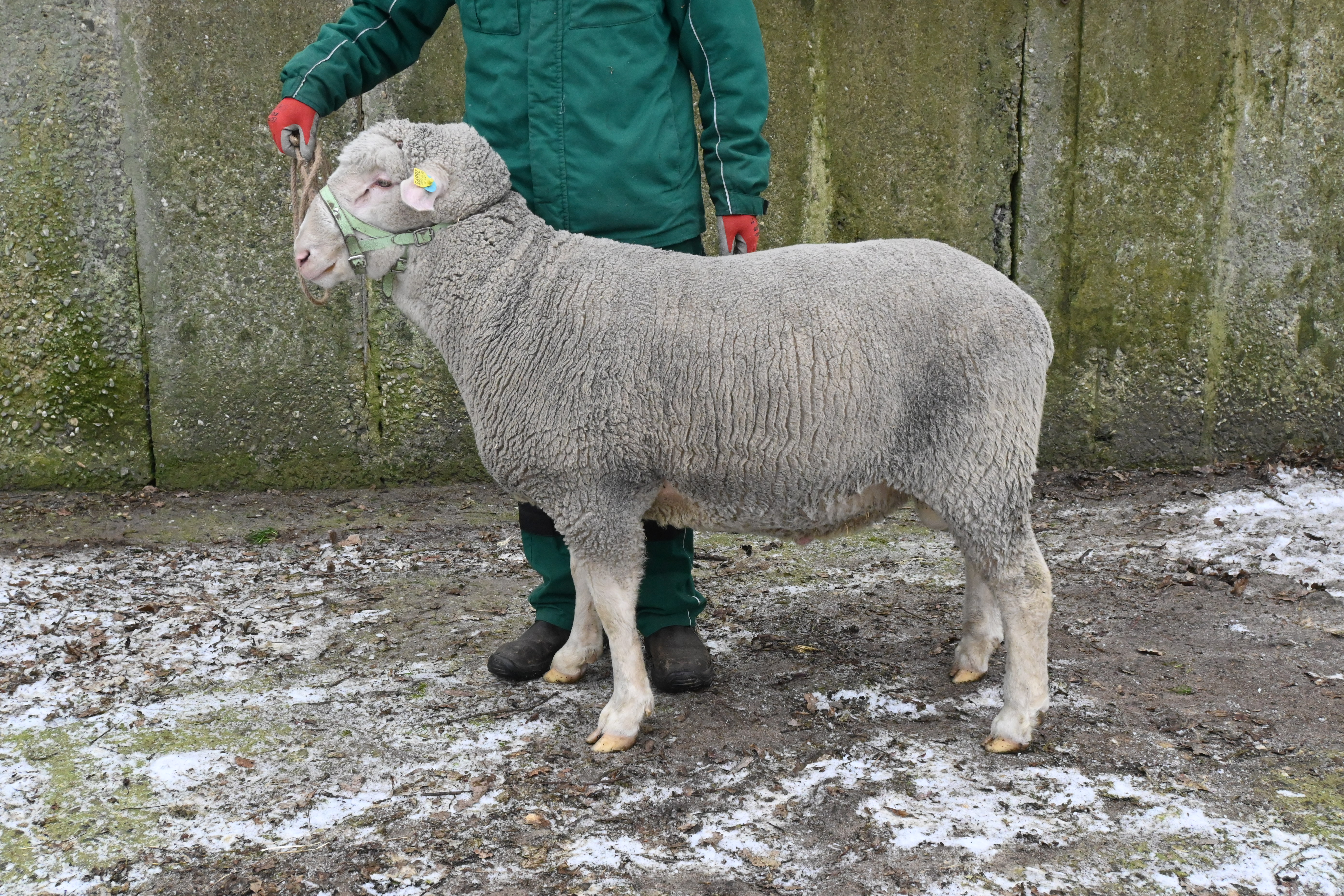 geboren: 18.11.2023, Einling, Vater: DE 01 03 115 95474 NDS-R, Linie BME, mit 100 Tagen 54,5 kg gewogen, tgl. Zunahme 490 g, Muskeldicke und Fettauflage bei Ultraschallmessung 34,0 mm und 9,7 mm, Körung mit 108,0 kg, WBE 9/8/7, ARR/ARR, Wollfeinheit 25,07 µm, Streuung 15,60 %