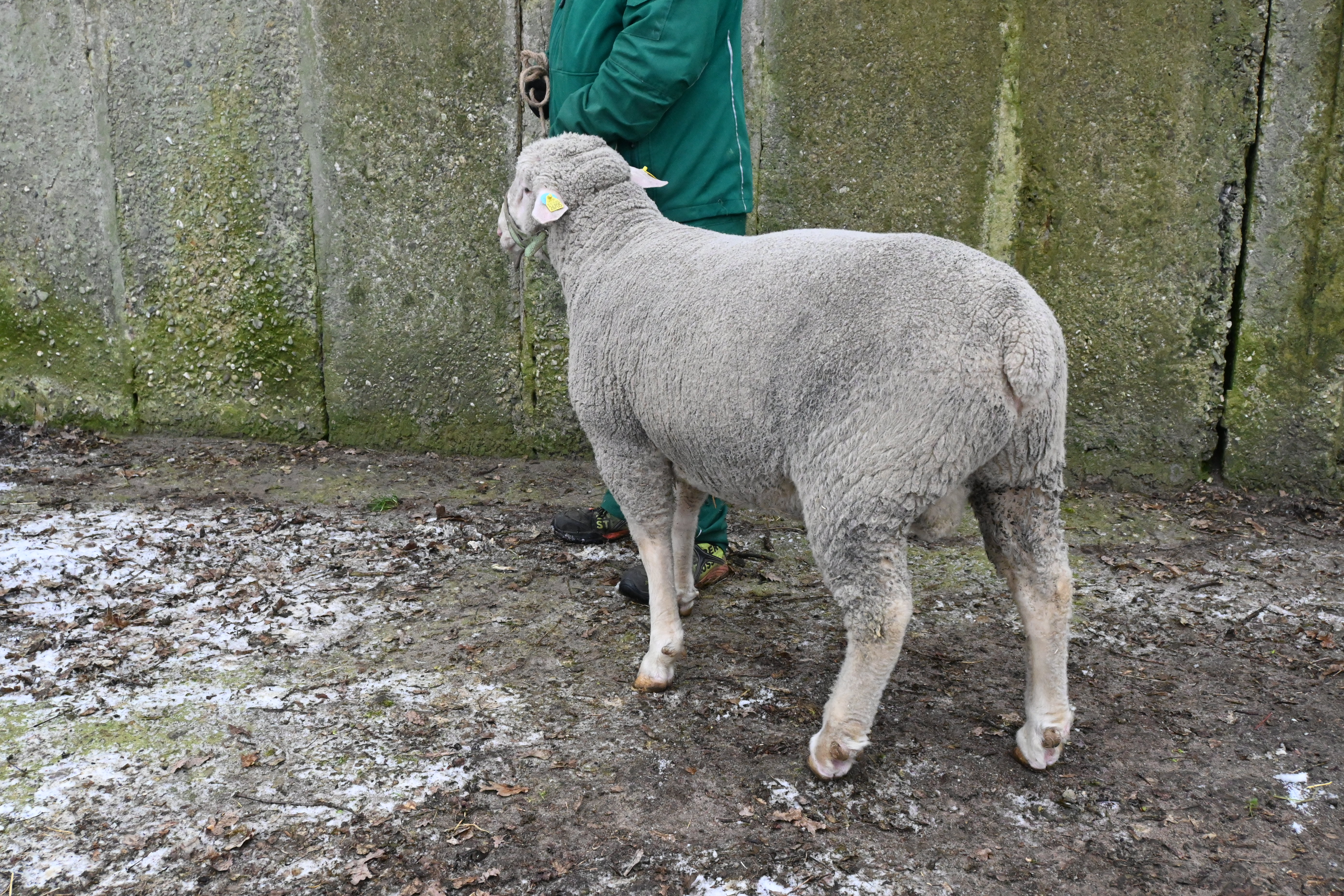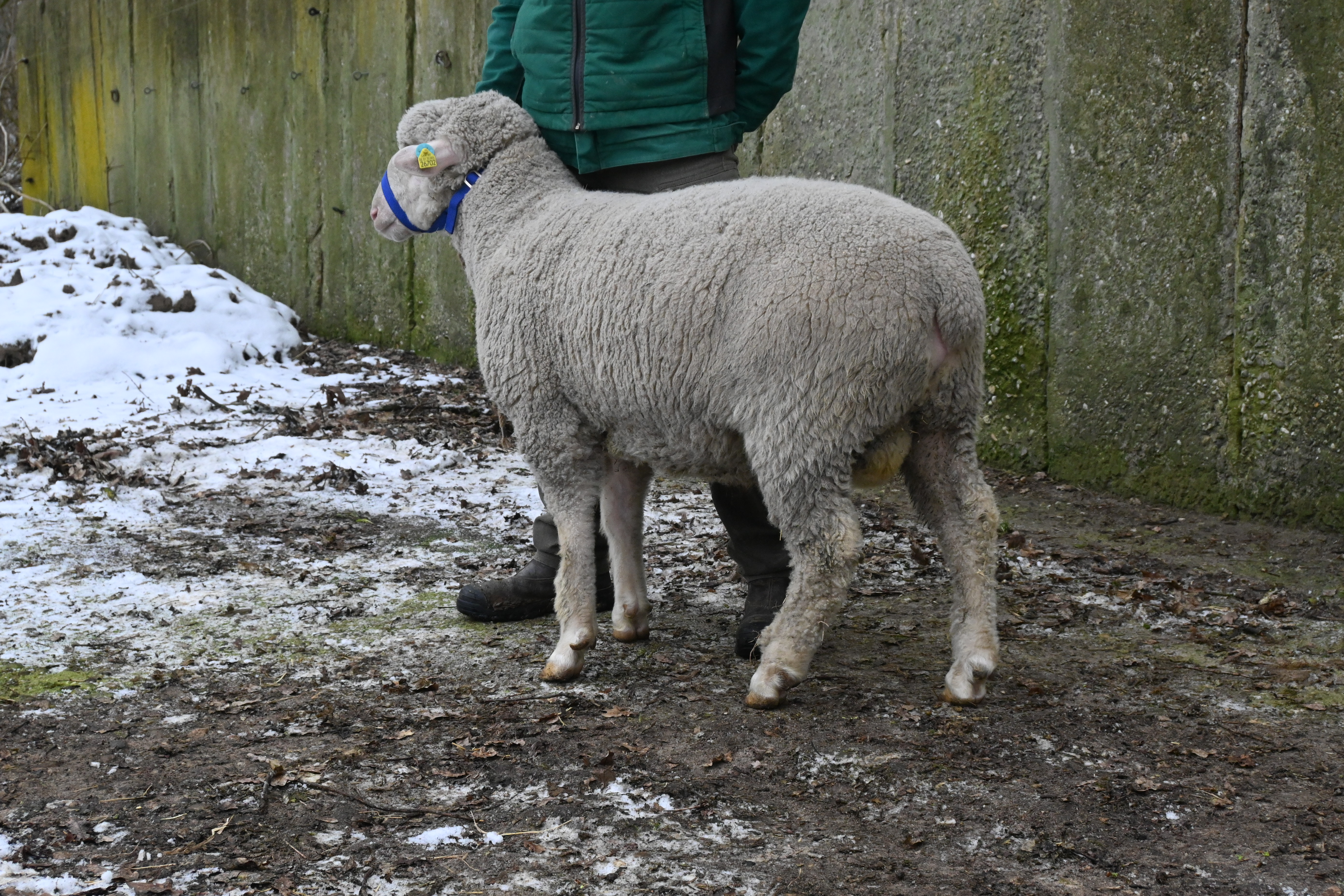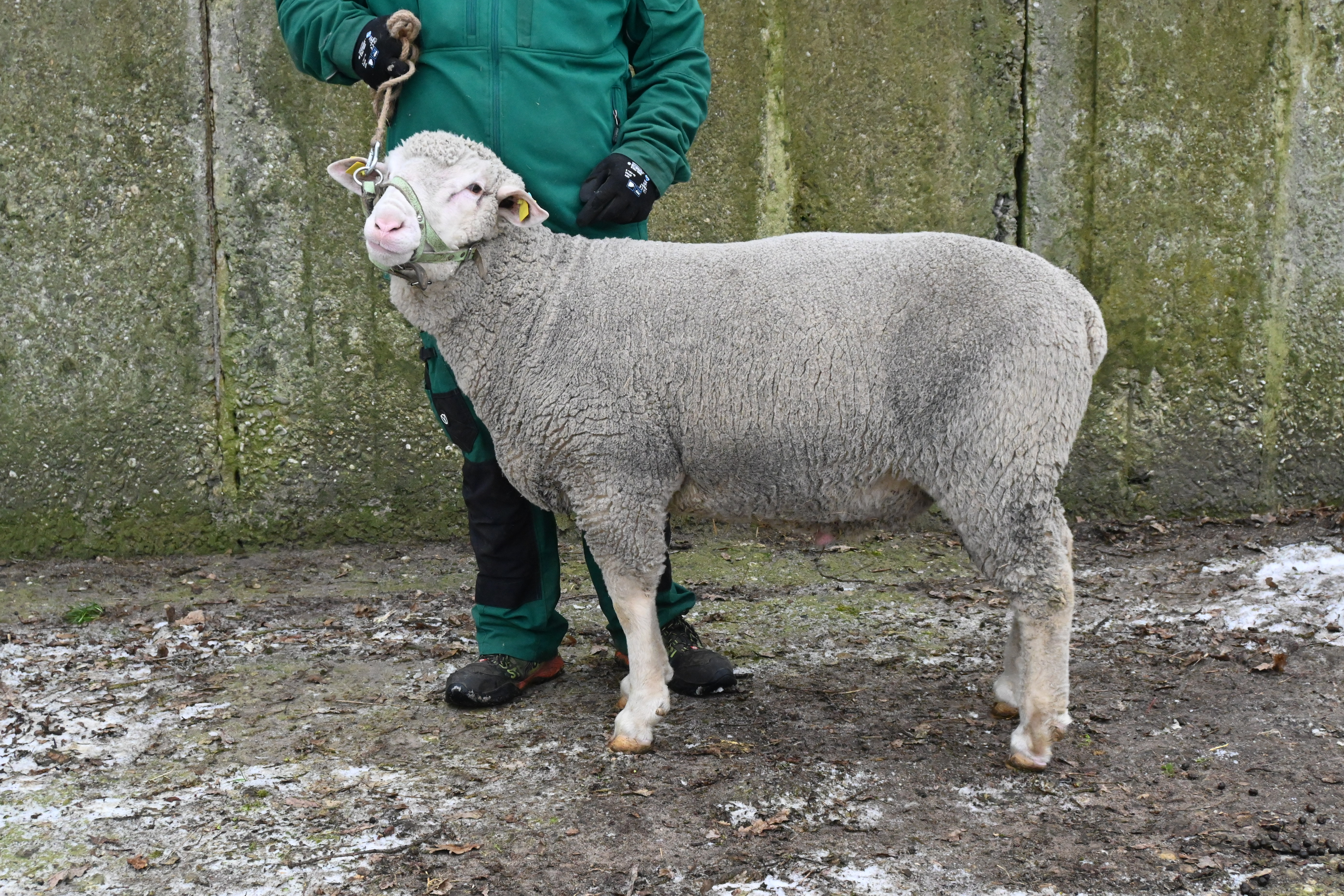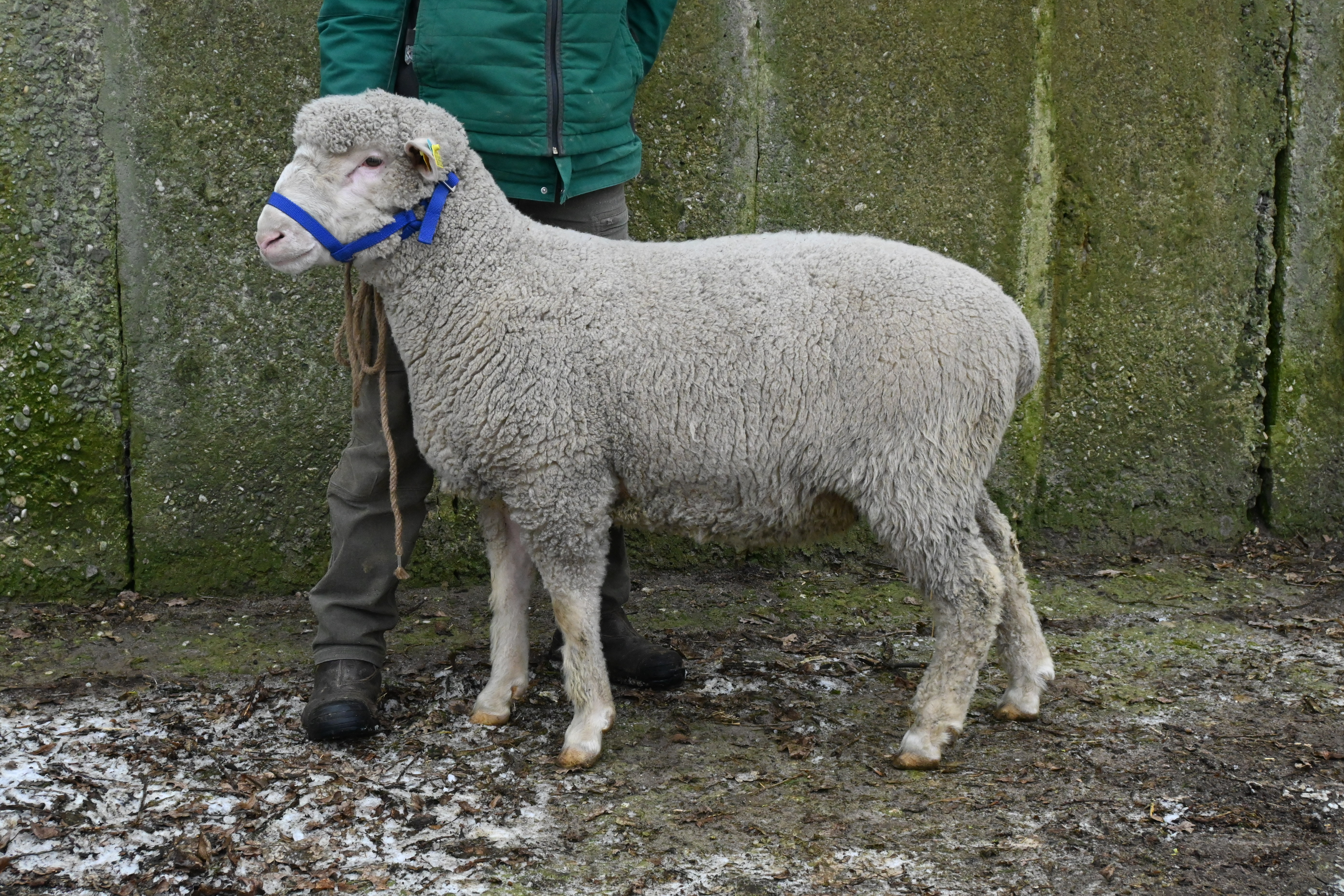 geboren: 30.01.2024, Einling, Vater: DE 01 14 005 38590 SN-SR, Linie BMB, mit 104 Tagen 43,4 kg gewogen, tgl. Zunahme 369 g, Körung mit 85,5 kg, WBE 7/8/7, ARR/ARR, Wollfeinheit 26,45 µm, Streuung 19,77 %