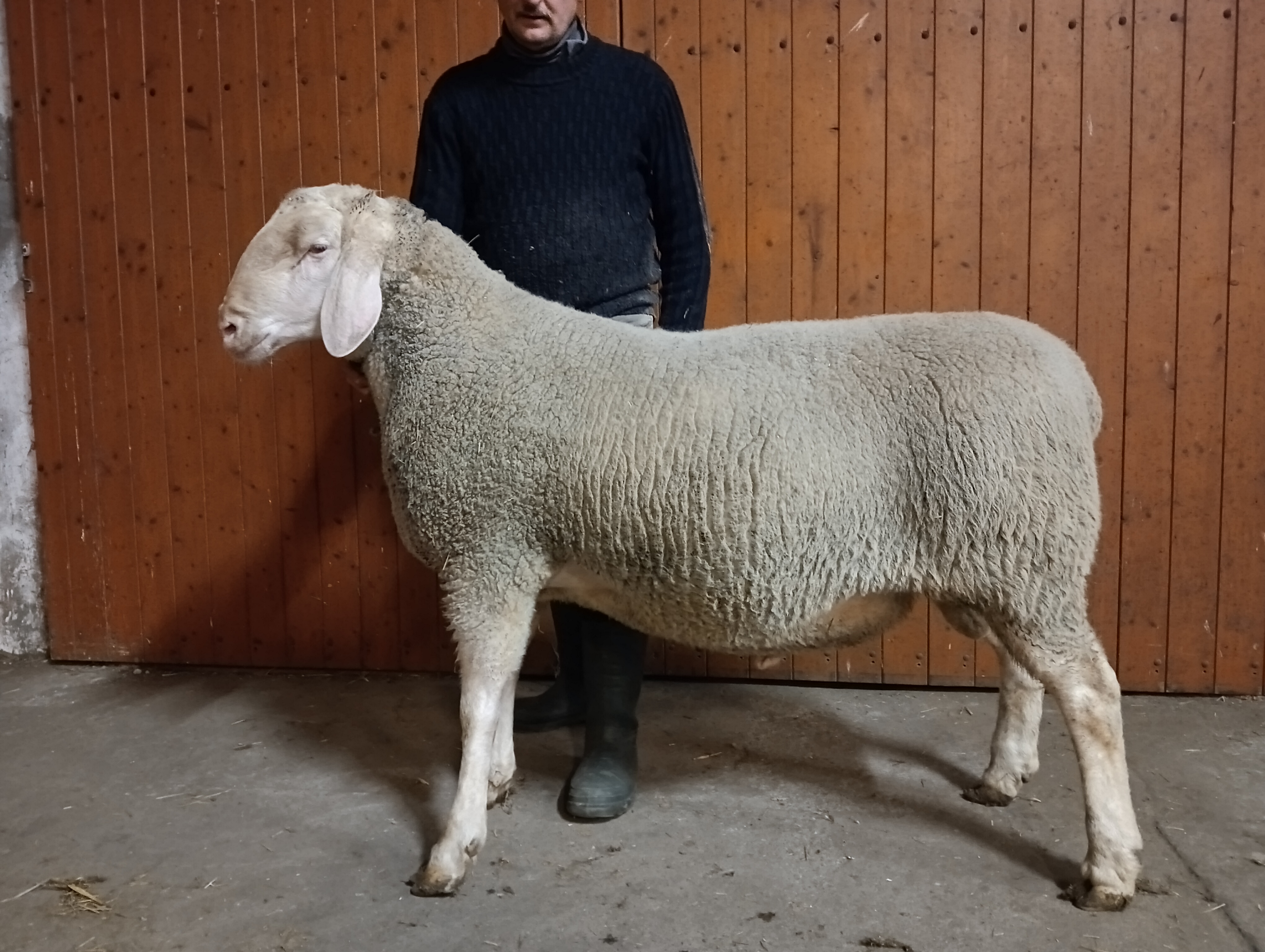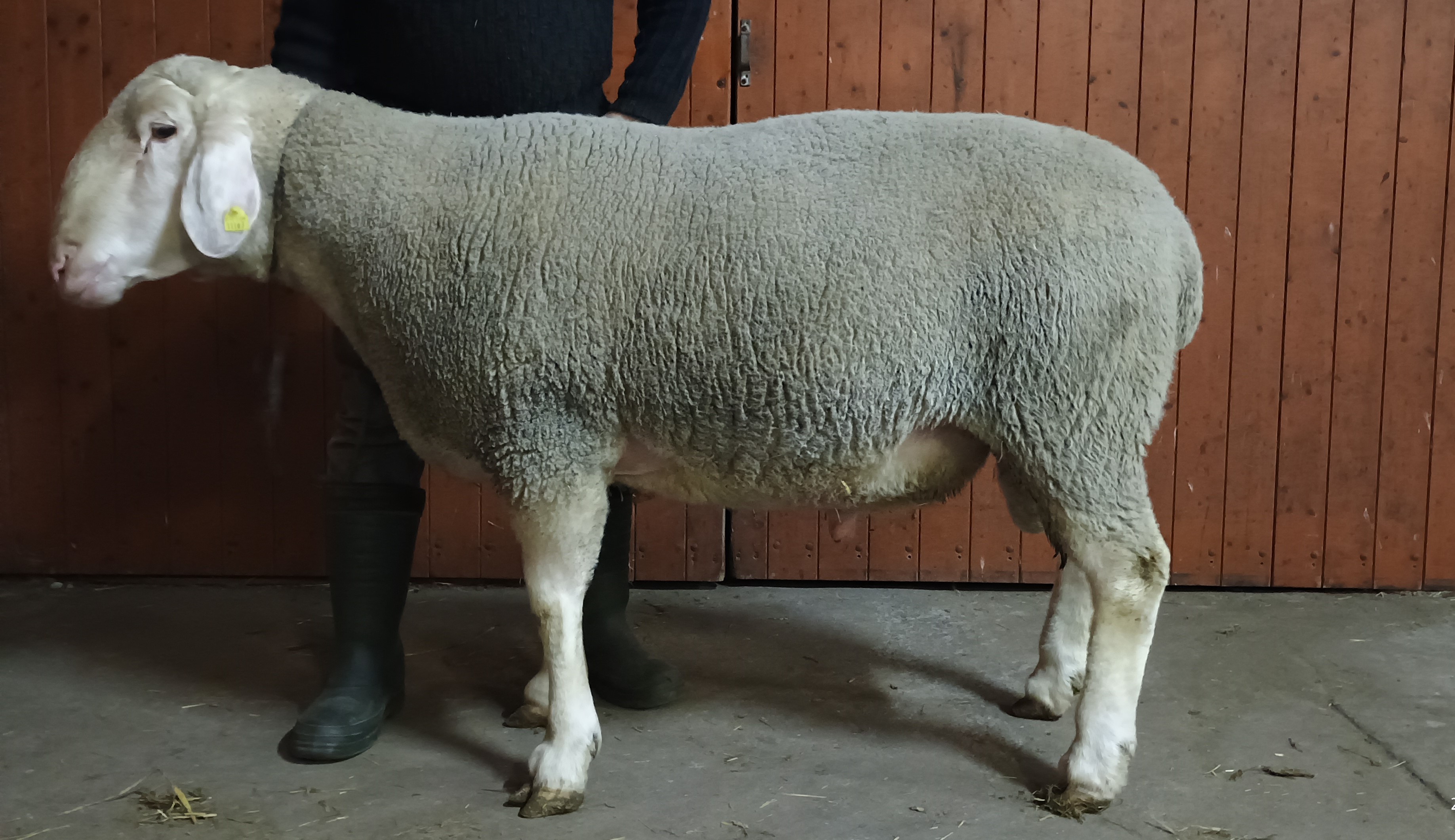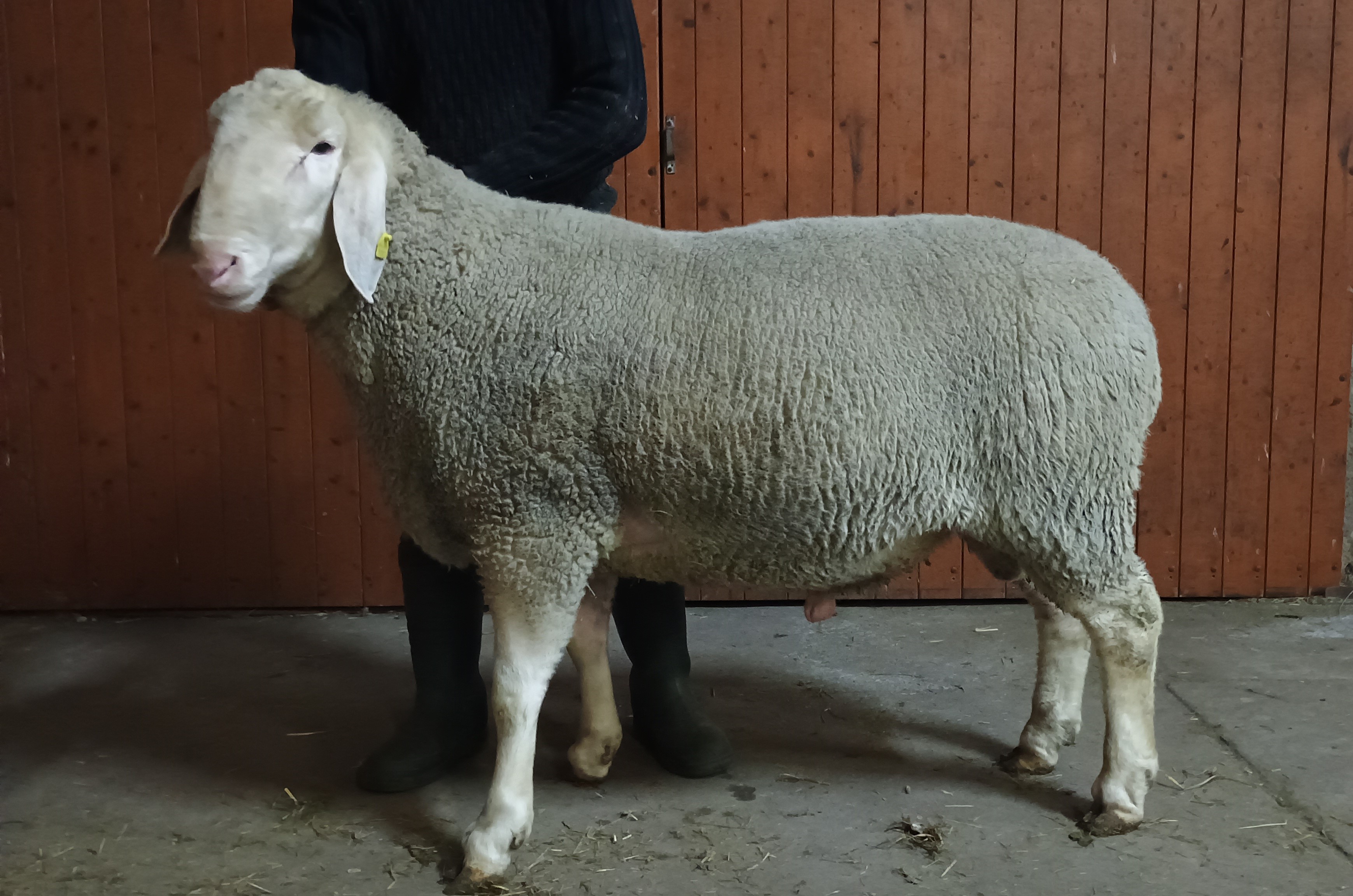 geboren: 14.10.2024, Zwilling, Rasse MLS, M-Linie, Vater: DE 01 15 005 52216 SA-RF, mit 97 Tagen 54,0 kg gewogen, tgl. Zunahme 515 g, Körung mit 133,0 kg, WBE 8/8/8, ARR/ARQ